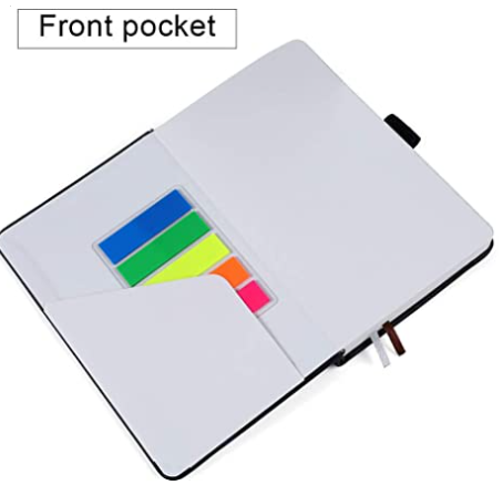 【BEST-SELLING BLACK LEATHER NOTEBOOK】: This medium 5.7 in by 8 in lined notebook features durable and water-resistant vegan leather cover, rounded corners, 160 pages, inner expandable pocket, sticker labels, ribbon bookmark & elastic closure band.